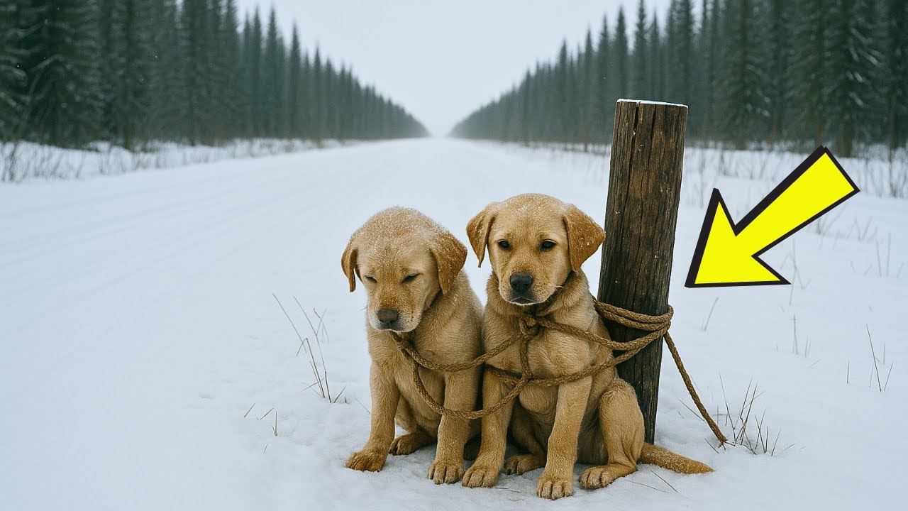 Ao se aproximar da área, Thomas viu as duas criaturas tremendo violentamente no chão, com uma delas com a pata sangrando e a outra tão fraca que não conseguia nem levantar a cabeça. Ambas estavam atadas a uma estaca de madeira quebrada, com as cordas apertadas ao redor de seus pequenos corpos. Elas não latiram, não resistiram. Apenas olharam para ele, congeladas, silenciosas e quase apagando. O coração de Thomas se apertou. Ele se ajoelhou na neve, suas mãos rígidas tentando desfazer as cordas que as prendiam. Quando finalmente conseguiu soltá-las, ele as envolveu em seu casaco e as levou rapidamente para o caminhão, determinado a salvar aquelas vidas.