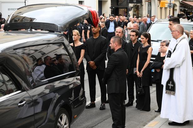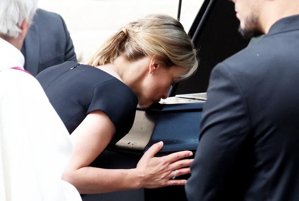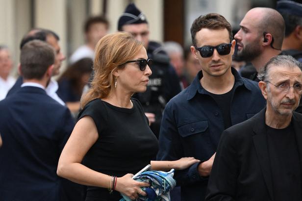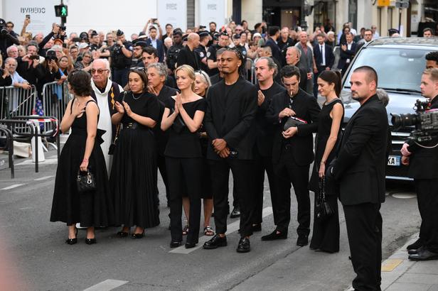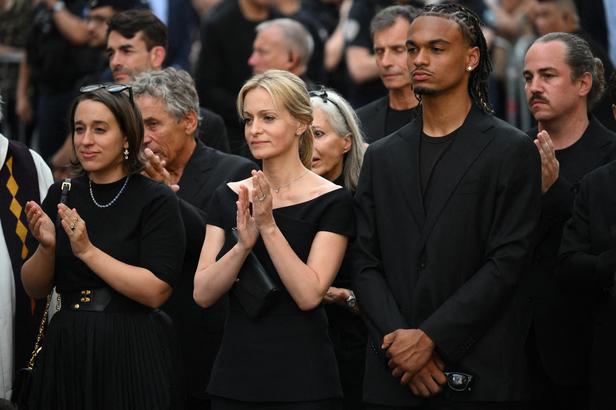 Audrey Crespo-Mara, Sékou Mara et Manon Ardisson applaudissent face au corbillard à la sortie de la cérémonie qui a eu lieu à l’église Saint-Roch à Paris, France, le 17 juillet 2025. – Blondet-Papixs/ABACA