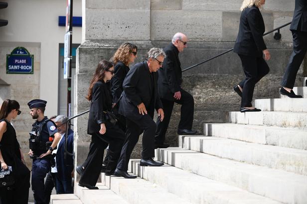 Le clan de Thierry Ardisson lui rend un dernier hommage à la sortie de la cérémonie qui a eu lieu à l’église Saint-Roch à Paris, France, le 17 juillet 2025. – Blondet-Papixs/ABACA