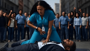 Du sang coulait d’une coupure à sa tempe. Elle pressa ses mains tremblantes contre sa poitrine. “Reste avec moi”, murmura-t-elle. “Allez, respirez.” Un inconnu a tenté de la retenir. “Madame, vous êtes enceinte. Laissez faire quelqu’un d’autre.” Je suis médecin”, a-t-elle rétorqué en commençant déjà le massage cardiaque. “Comtez avec moi.