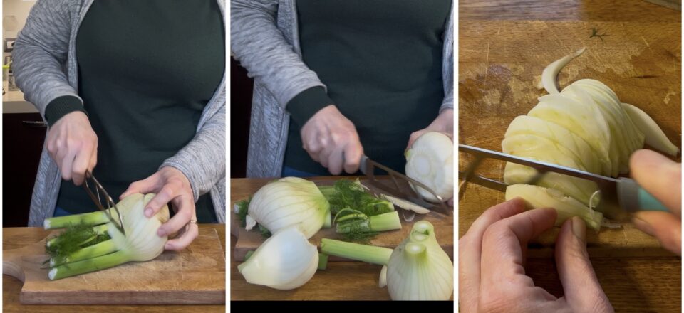 Per fare i finocchi al forno alla mediterranea iniziate dallo sciacquare i finocchi, quindi privateli della barba e delle foglie più esterne e divideteli a metà. Fatto questo affettateli e raccoglieteli in una ciotola,