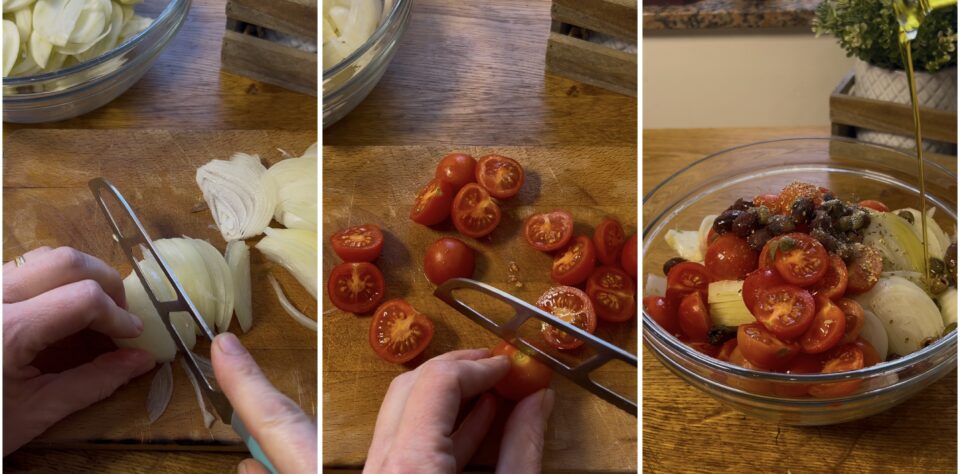 aggiungete la cipolla, pelata, sciacquata e affettata. Aggiungete anche i pomodorini sciacquati e divisi a metà, le olive, i capperi, il sale, l’origano e un giro d’olio.
