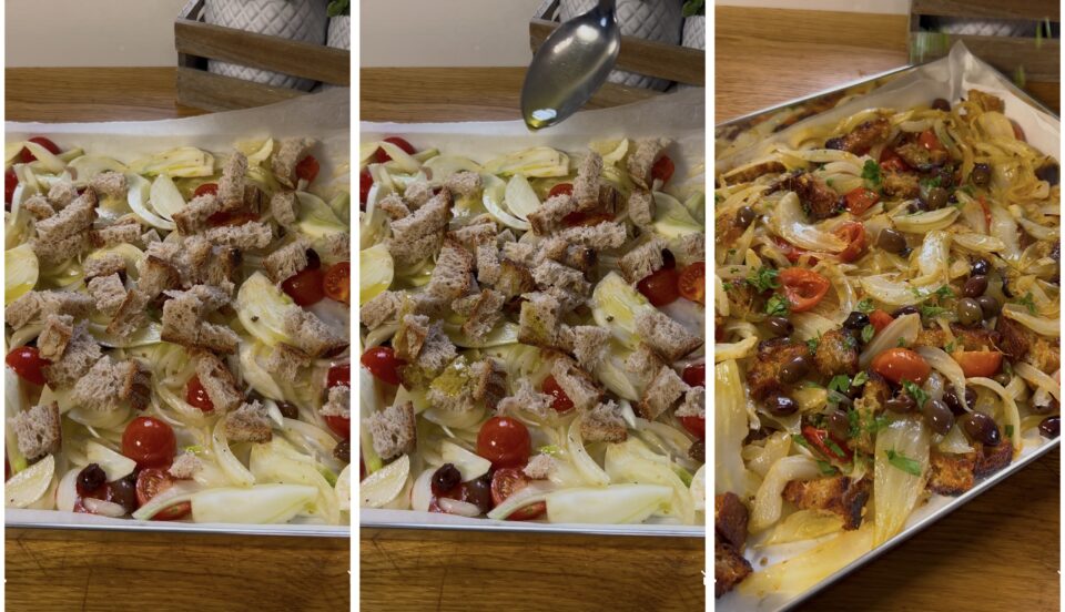 Mescolate il tutto e spostatelo su una teglia ricoperta di carta forno. Tagliate il pane a cubetti,meglio se vecchio di un paio di giorni, unitelo al resto degli ingredienti,