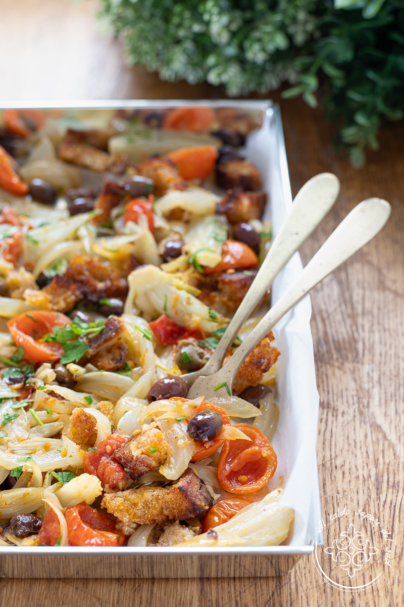 Come si fanno i finocchi al forno con paomodorini, cipolle e olive