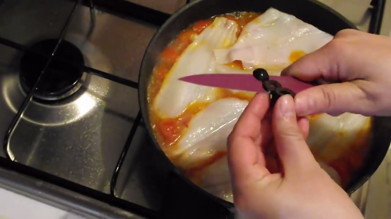 Subito dopo, distribuite sui filetti e nel sugo le olive nere tagliate a rondelle e una generosa manciata di prezzemolo tritato. Se avete deciso di usarlo, questo è anche il momento di aggiungere il peperoncino.