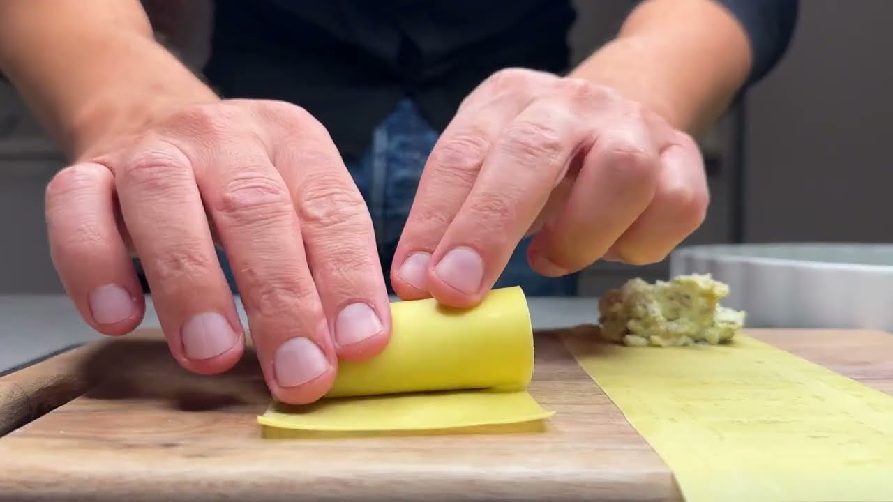 La Farcitura: Distribuite generosamente il ripieno di salsiccia e spinaci sopra lo strato di ricotta. Ora, arrotolate con cura ogni sfoglia su sé stessa, non troppo stretta, per creare dei cilindri eleganti.