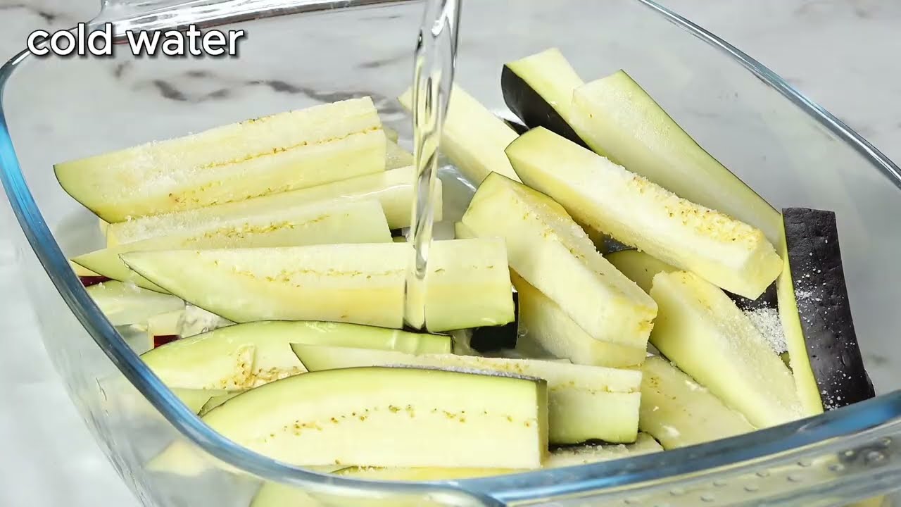 Questa ricetta inizia con una mossa geniale: tagliare le melanzane a bastoncini e immergerle in acqua fredda salata per 20 minuti.