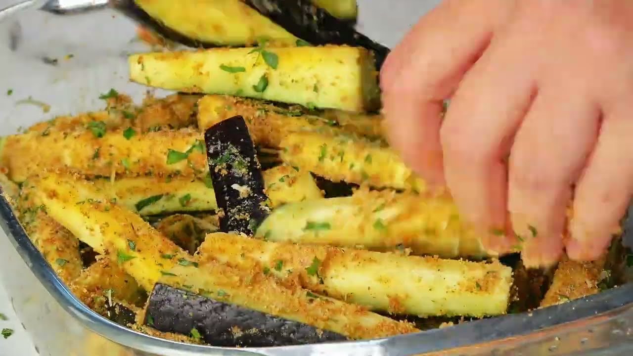 Anche la procedura di impanatura è leggermente diversa. Dopo che le melanzane sono state asciugate, vengono mescolate con 2 cucchiai di olio d’oliva. Questo aiuta la “corazza” ad aderire meglio e, cosa più importante, aiuta i bastoncini di melanzana stessi a “friggersi” dall’interno, mantenendoli morbidi anziché secchi.