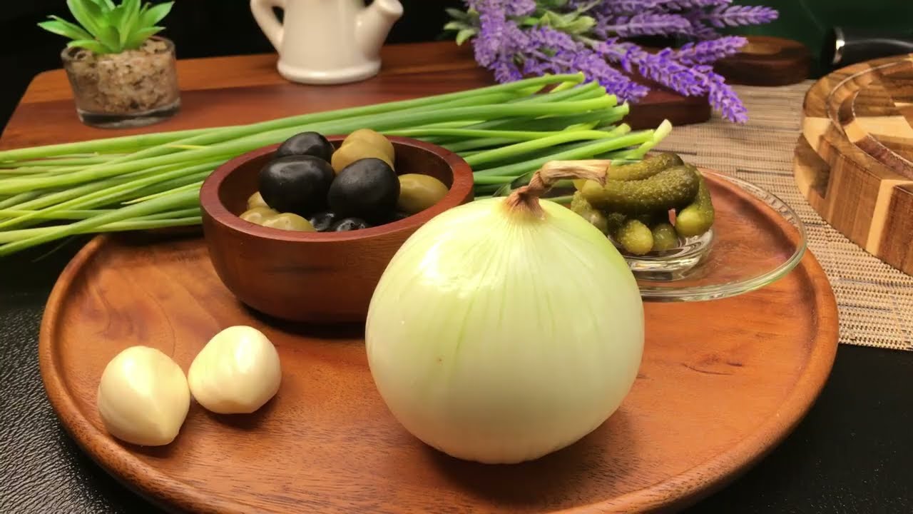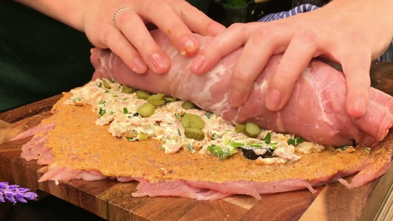 Questo è il momento in cui ogni ospite tratterrà il respiro. Una spirale perfetta di carne di maiale rosata e umida, che avvolge uno strato di ripieno ricco e cremoso, punteggiato dal verde dei cipollotti, dal rosso della pancetta e dal verde scuro delle olive e dei cetriolini.