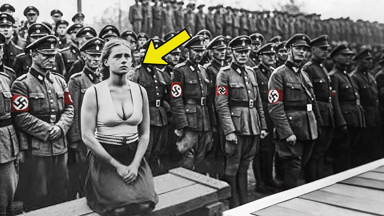 L’image en noir et blanc montrait des rangées interminables de soldats nazis en formation. Leurs uniformes arboraient clairement des brassards à croix gammée. Une jeune femme était agenouillée sur un banc placé devant cette foule immense. Son visage était légèrement tourné sur le côté, exprimant l’inquiétude. Derrière elle, les soldats se tenaient au garde-à-vous, formant un rempart humain intimidant.